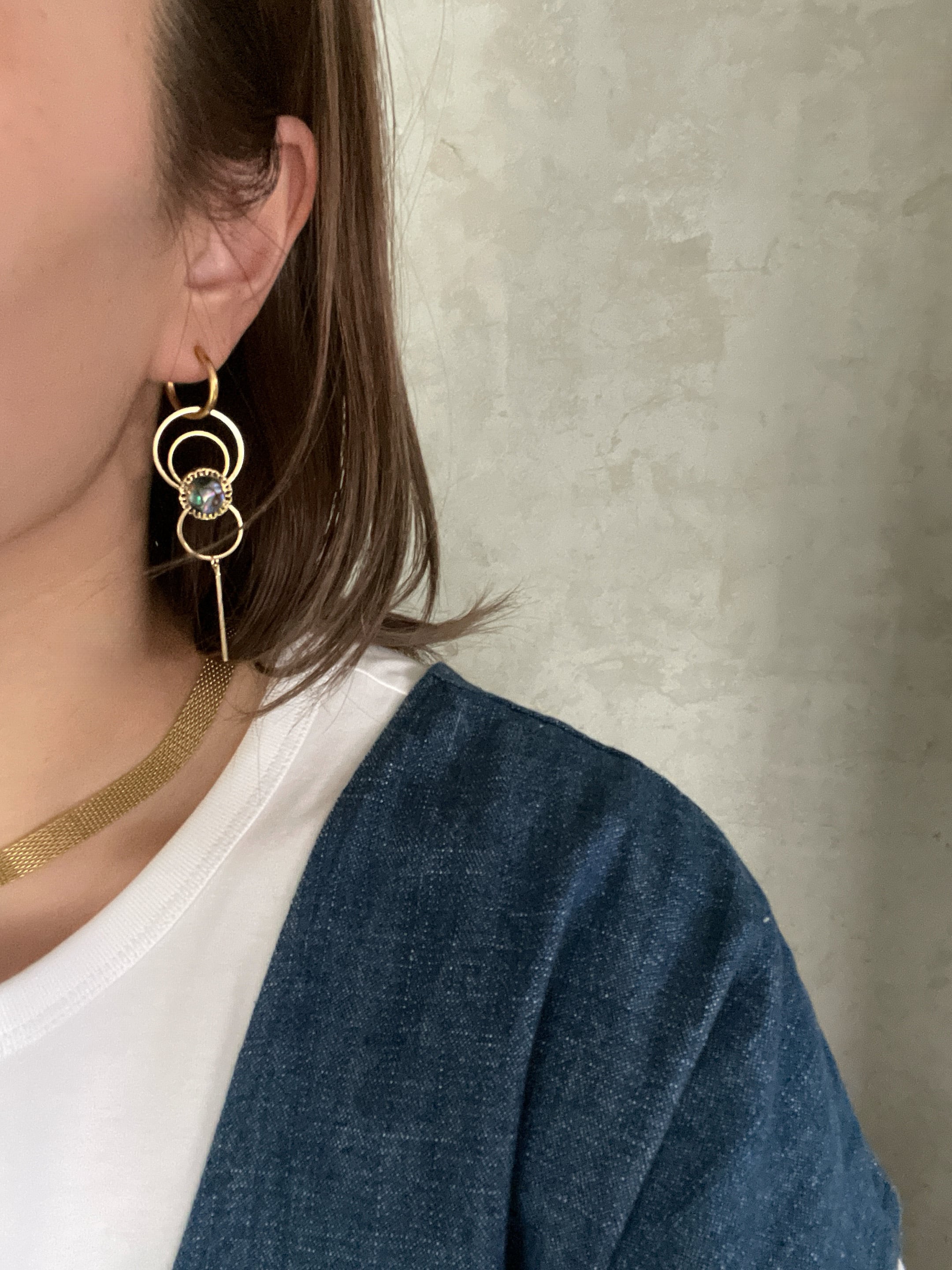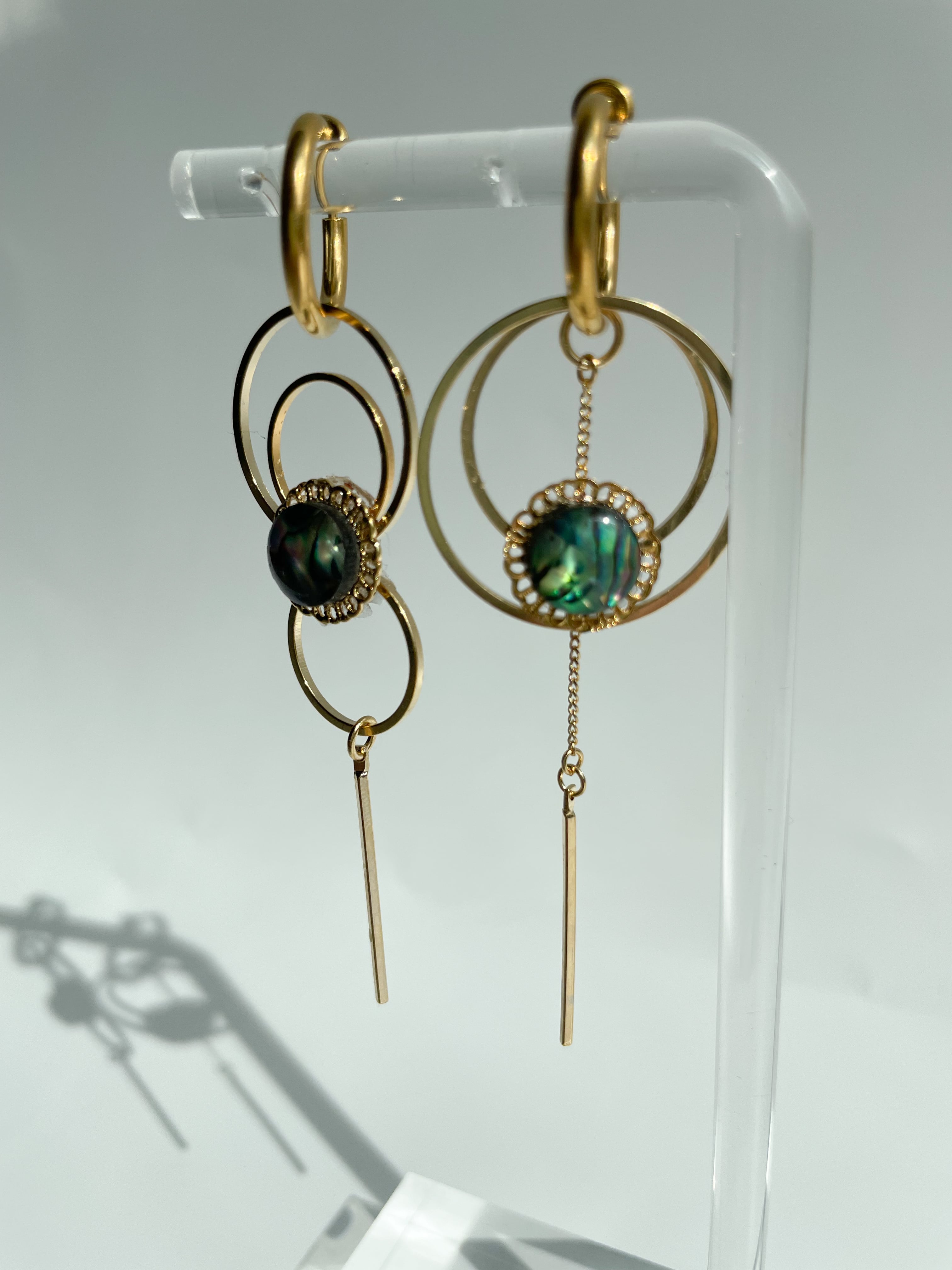 透かしパーツにアバロンシェル重ね様々な大きさのフープを連ねたデザインです。