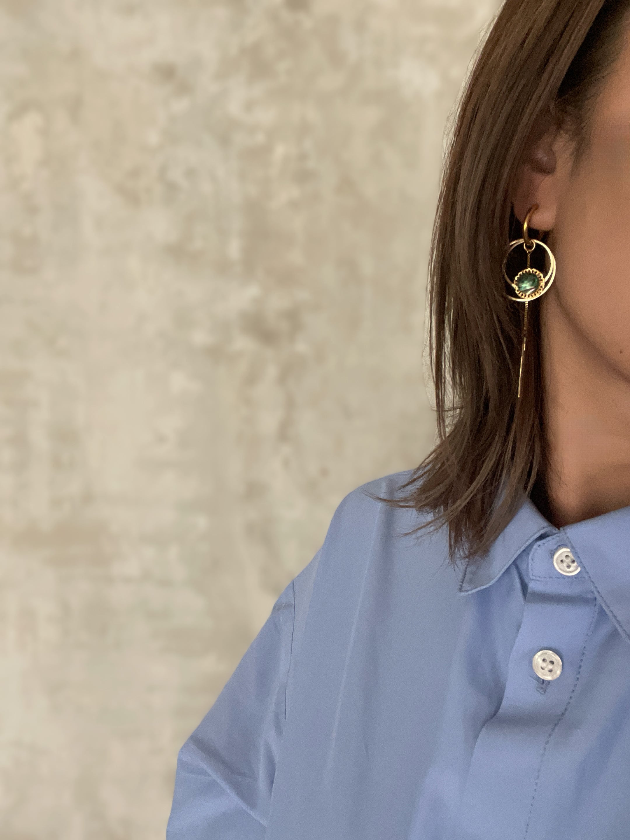左右でデザインの違うアシメデザインでアバロンシェルは顎上位置でお顔周りを華やかにしてくれ揺れ感もお楽しみ頂けるます。