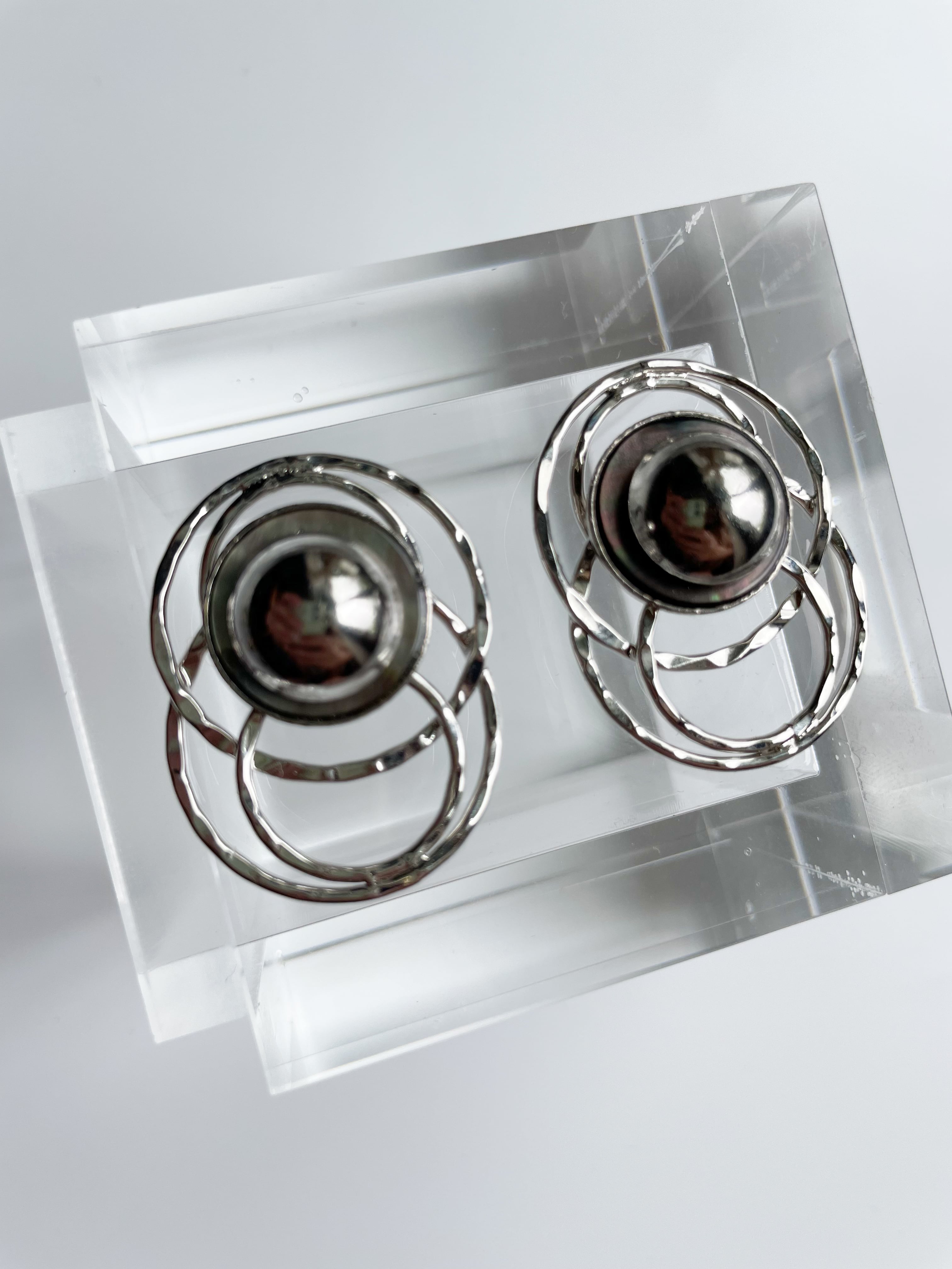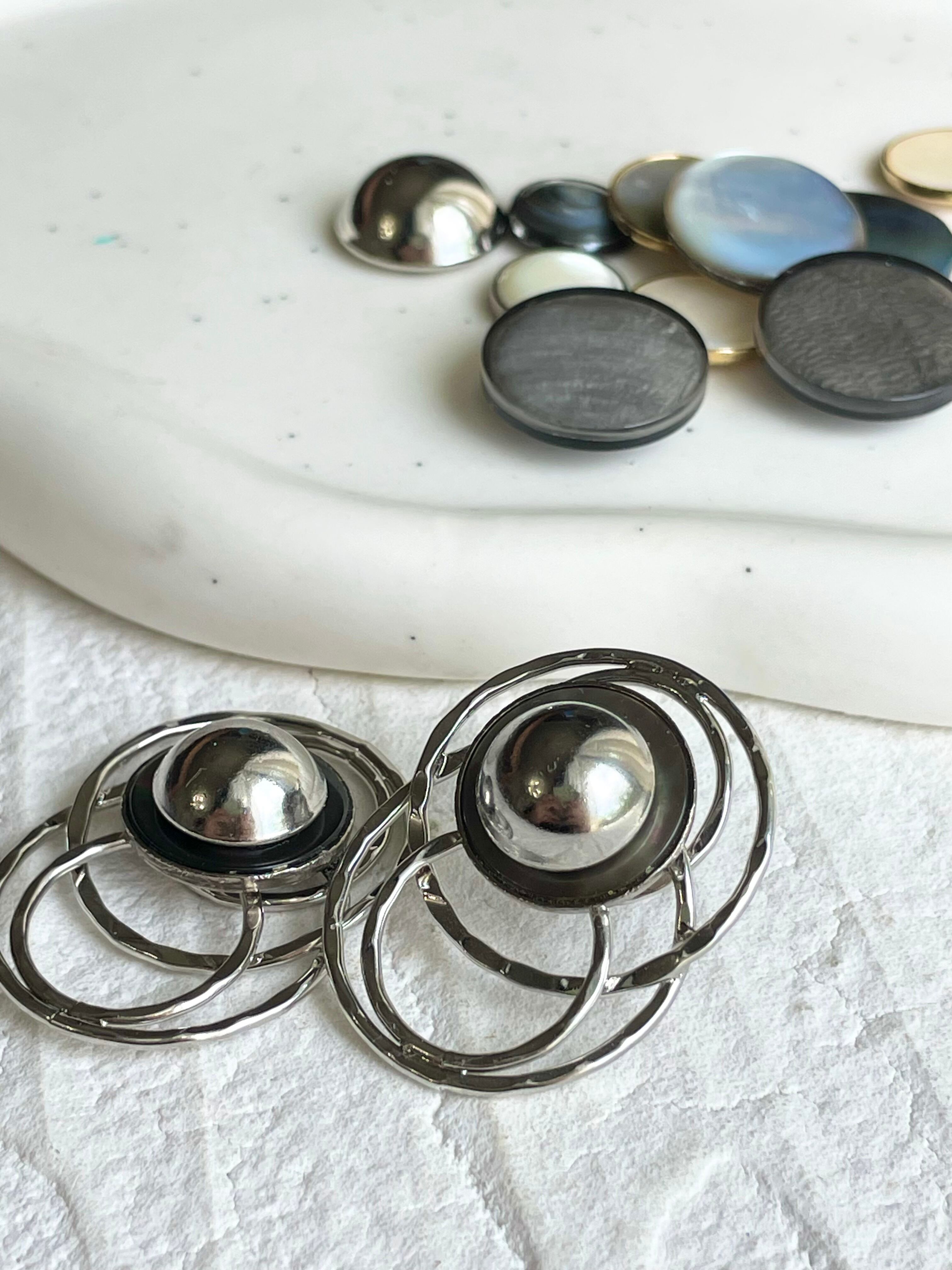 大小連なったデザインフープのチャームにsilverで縁取られた黒蝶貝のボタンを合わせたデザインです。
