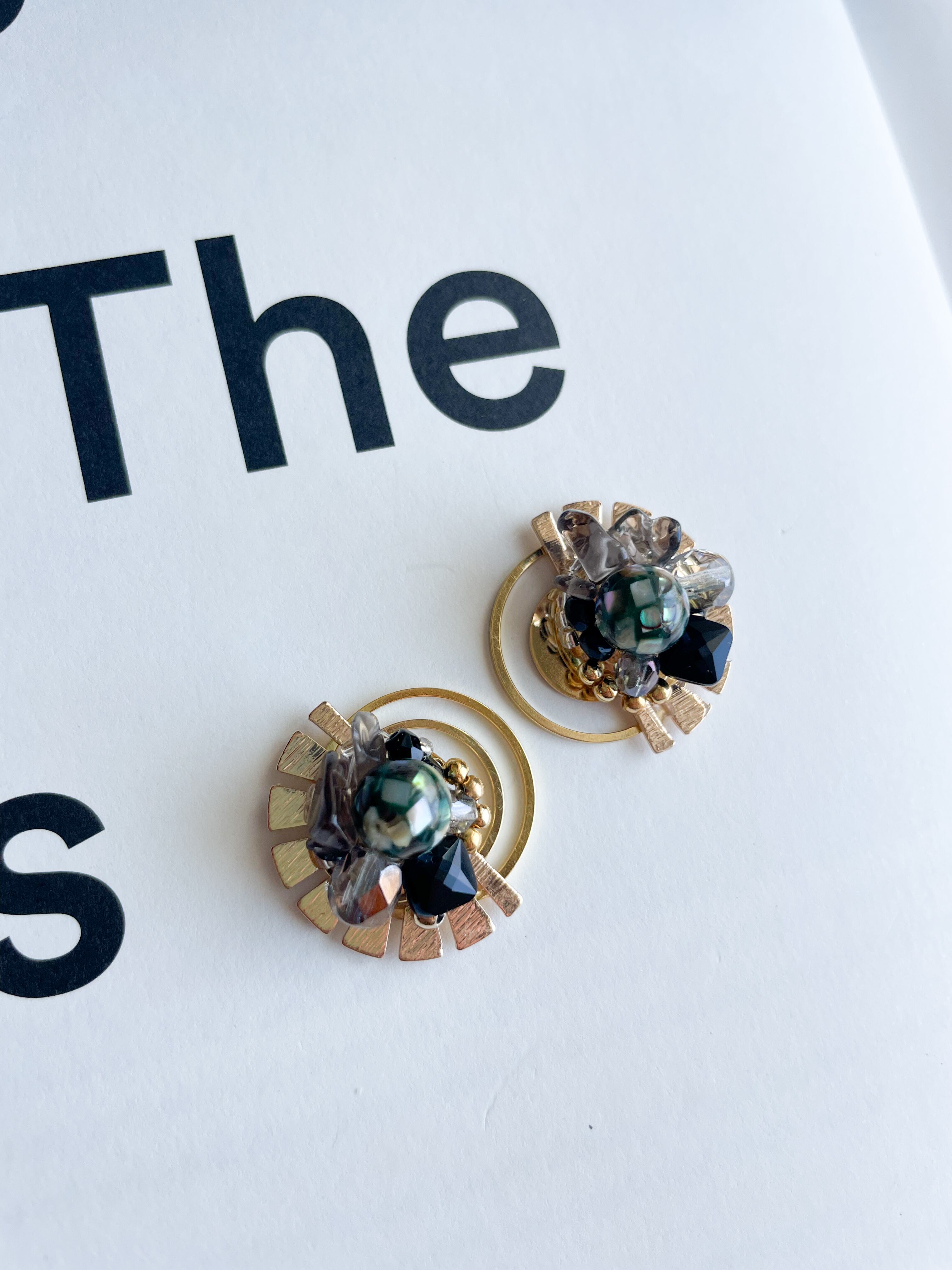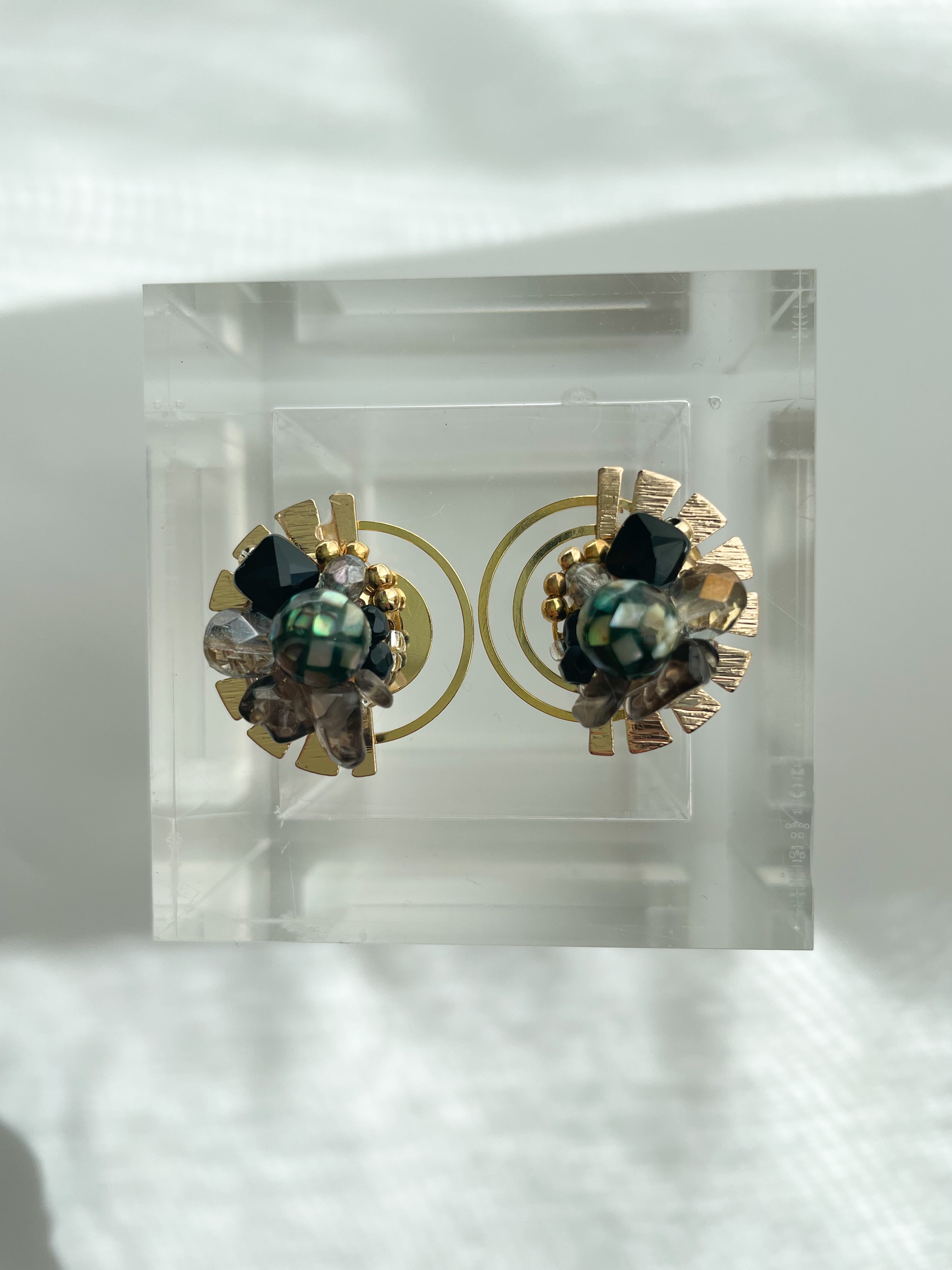 落ち着いた色味ながらも綺麗になりすぎない様所々に歪なビーズやスクエアのビーズで遊び心を差し込み普段使いしやすい様カジュアルダウンさせました。