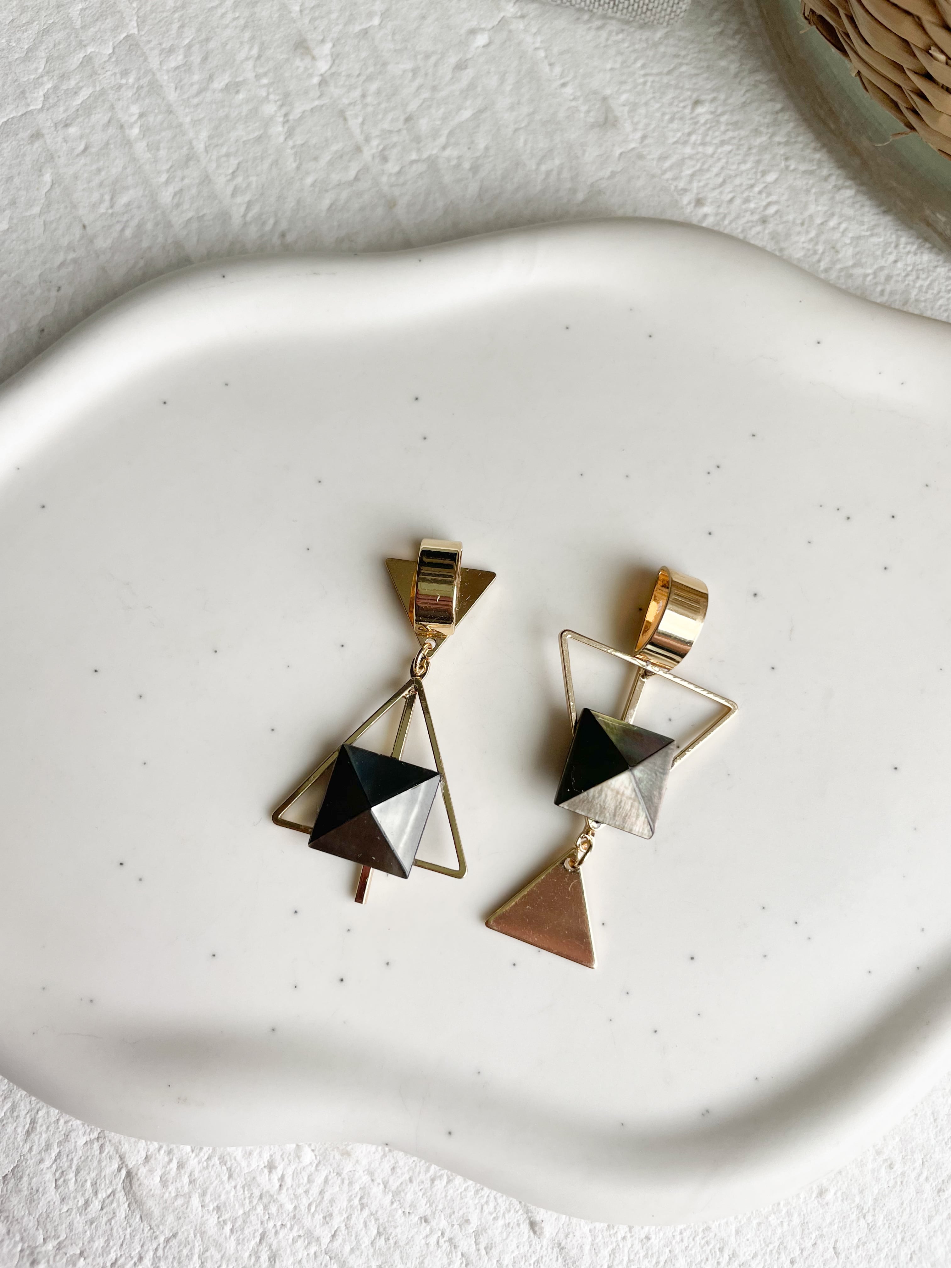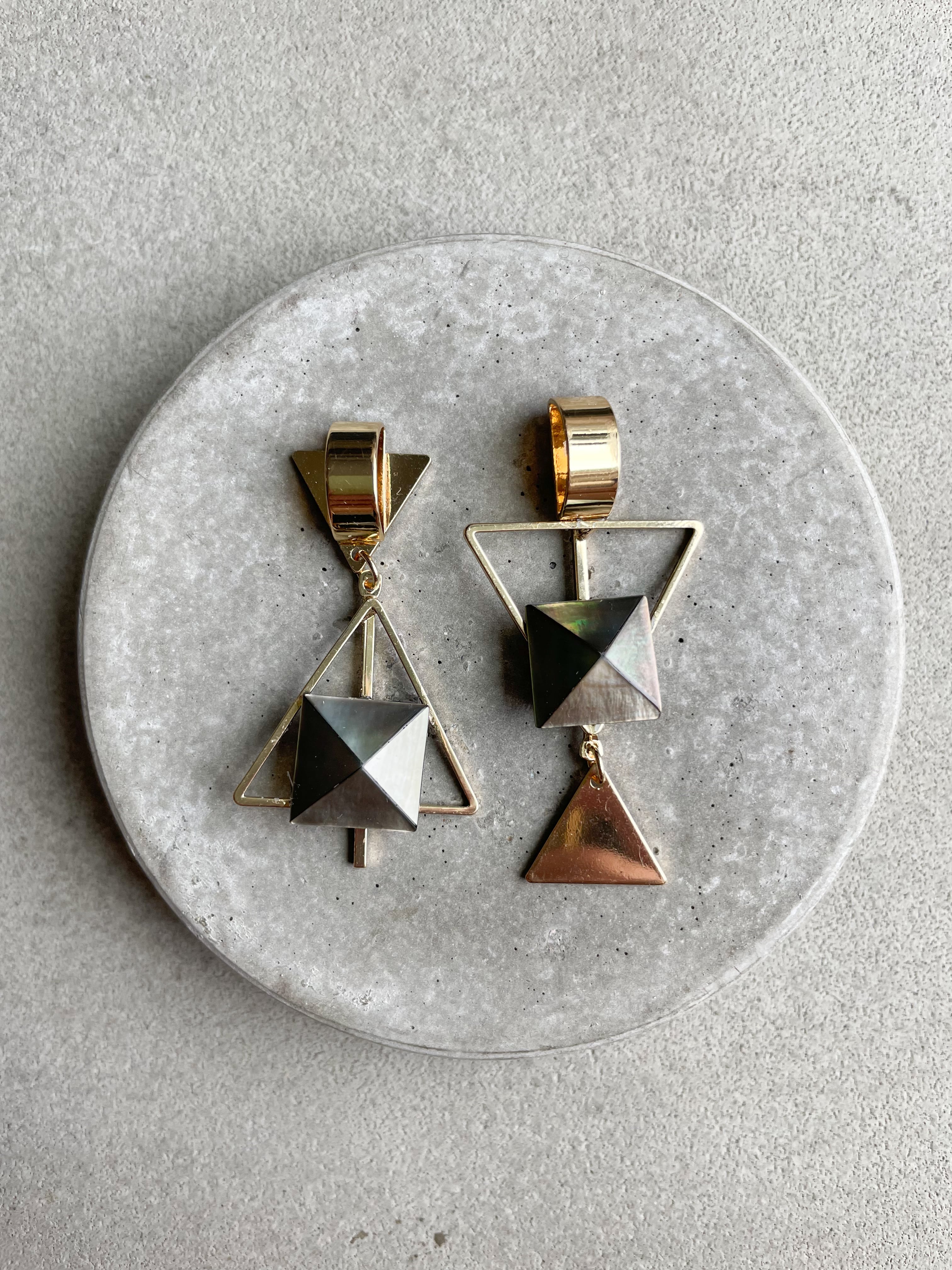 大きさや形の異なる三角パーツを組み合わせ個性的な線にあわせ黒蝶貝のスクエアパーツを合わせています。大人のカッコいいアシメデザイン。