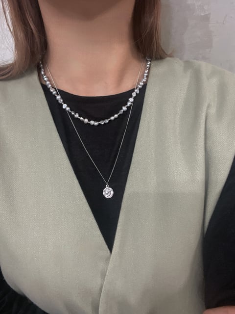 2種類のネックレスがそれぞれ留め具と長さ調整の出来るアジャスター付なので、耳元にボリュームがあるピアスの場合はコインnecklaceの単体使用にしたりオケージョンにはパールのみにするなど様々なシーンで使い分ける事の出来るネックレスです。
