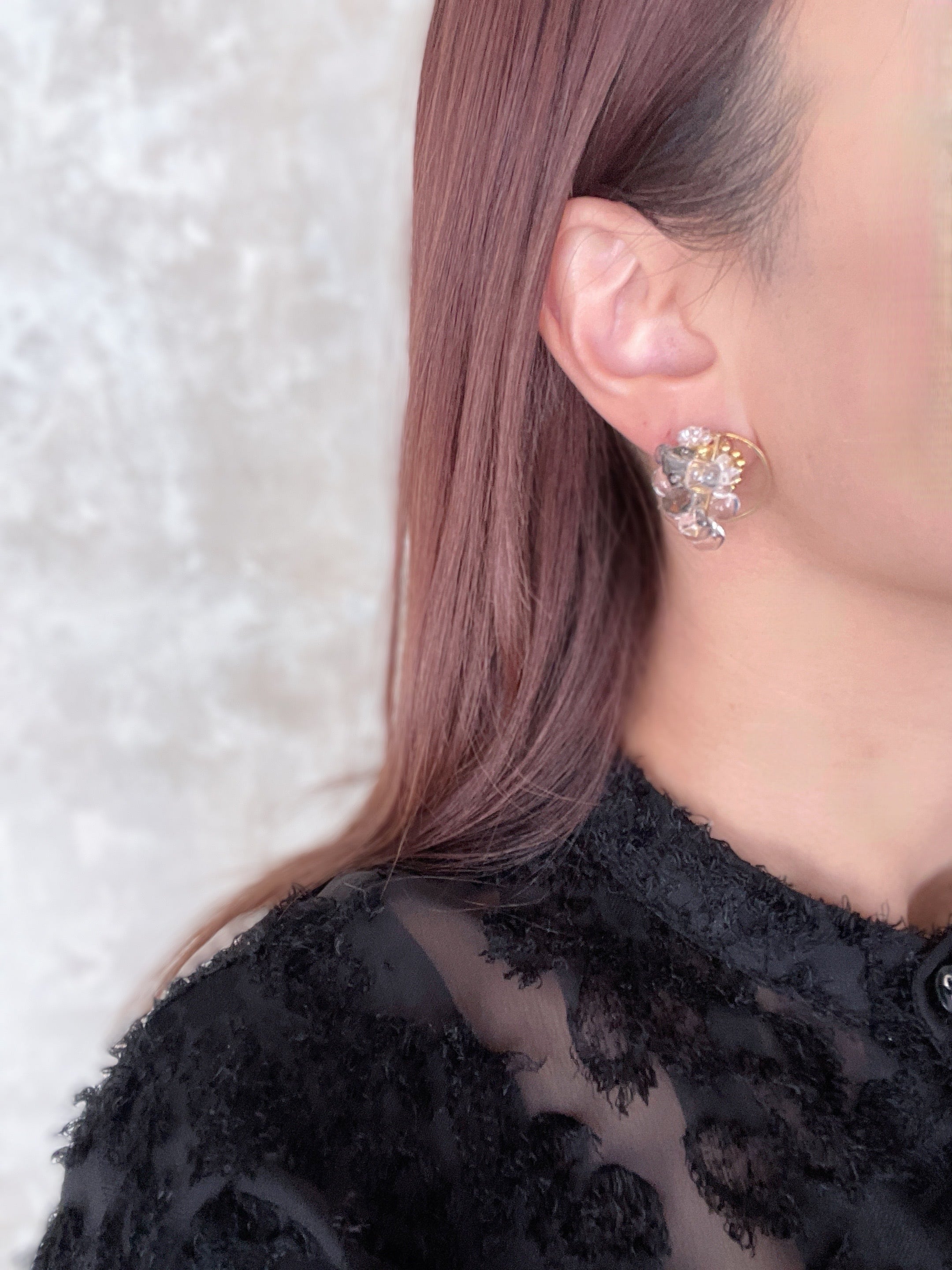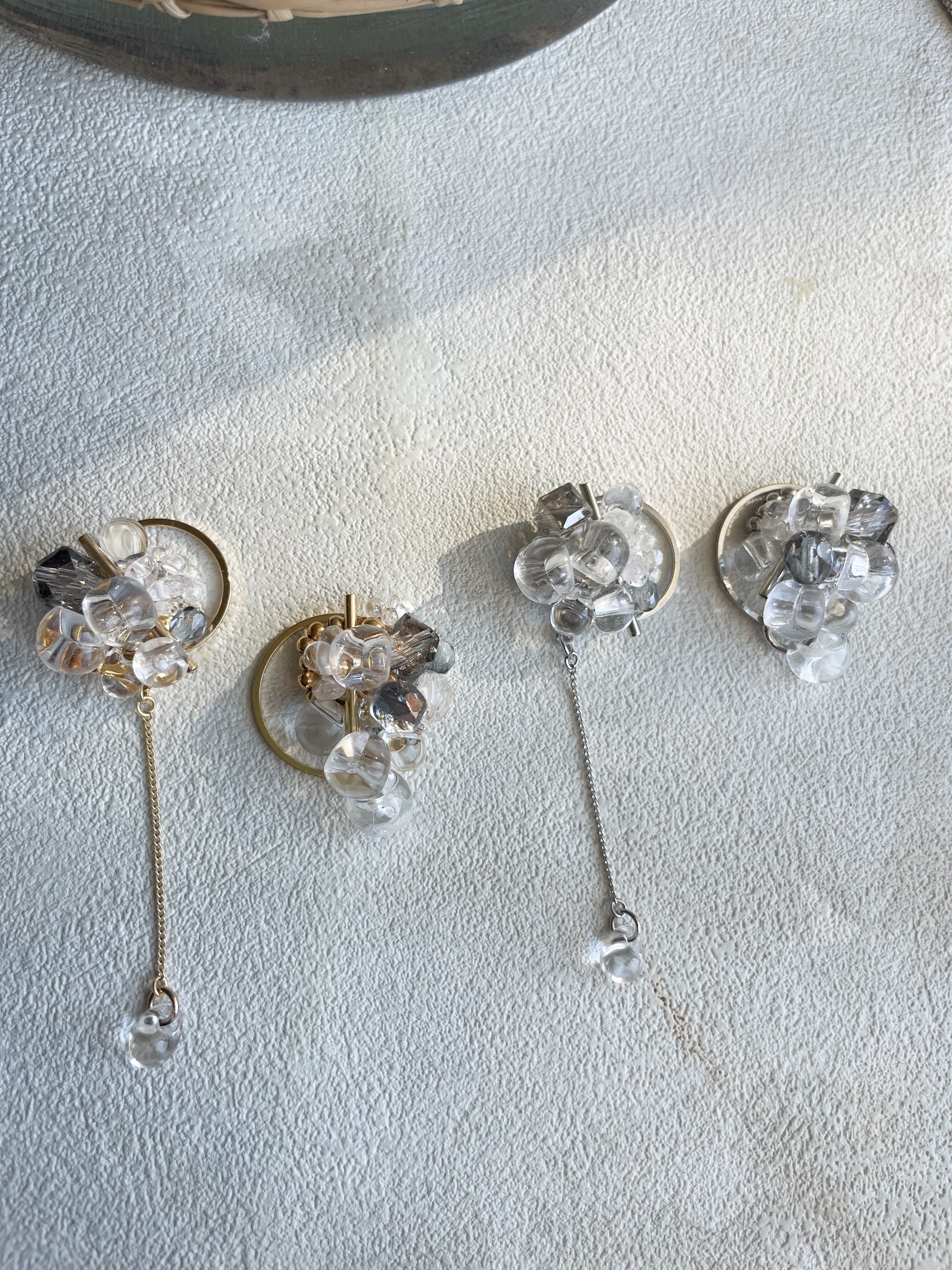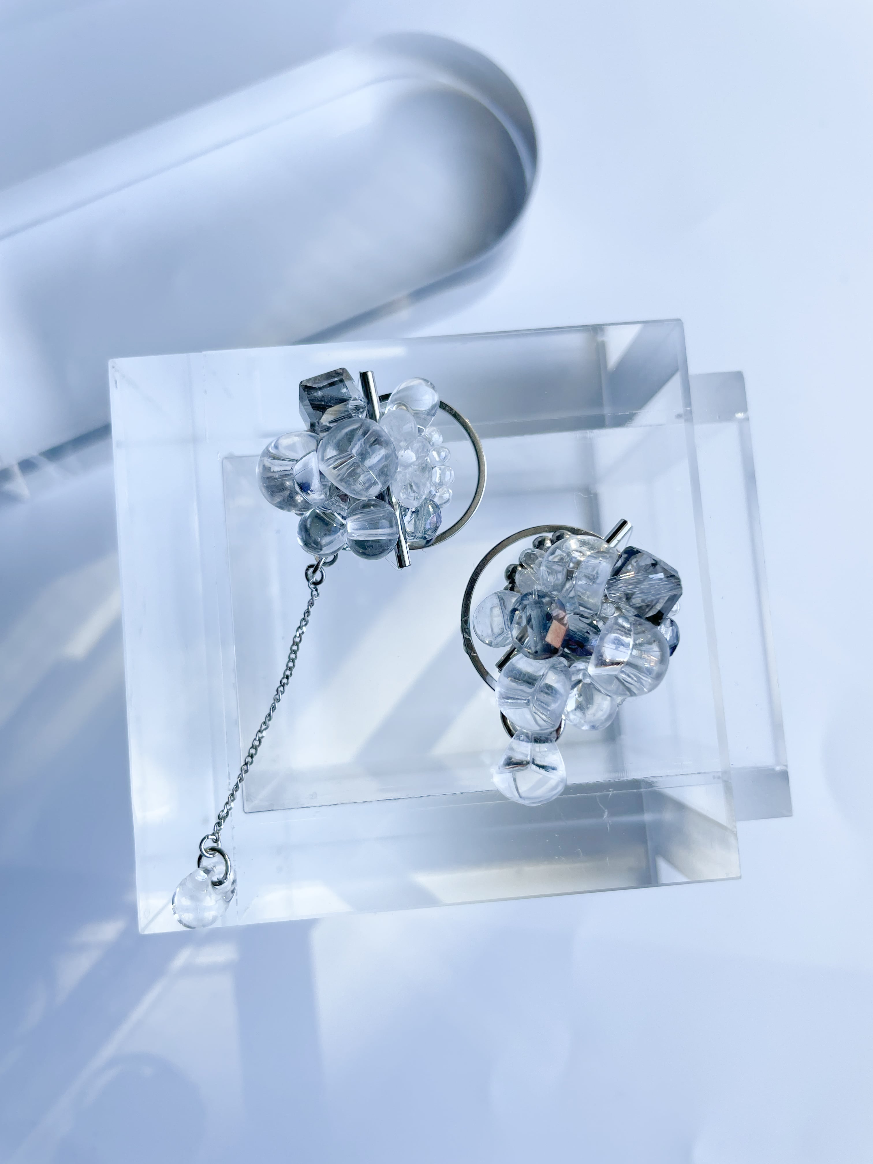 様々なクリアビーズを編み合わせクリアでぼやけない様工夫してこだわったビーズ達を合わせました。左右異なるデザインで人と被らない主役級のアイテムです。