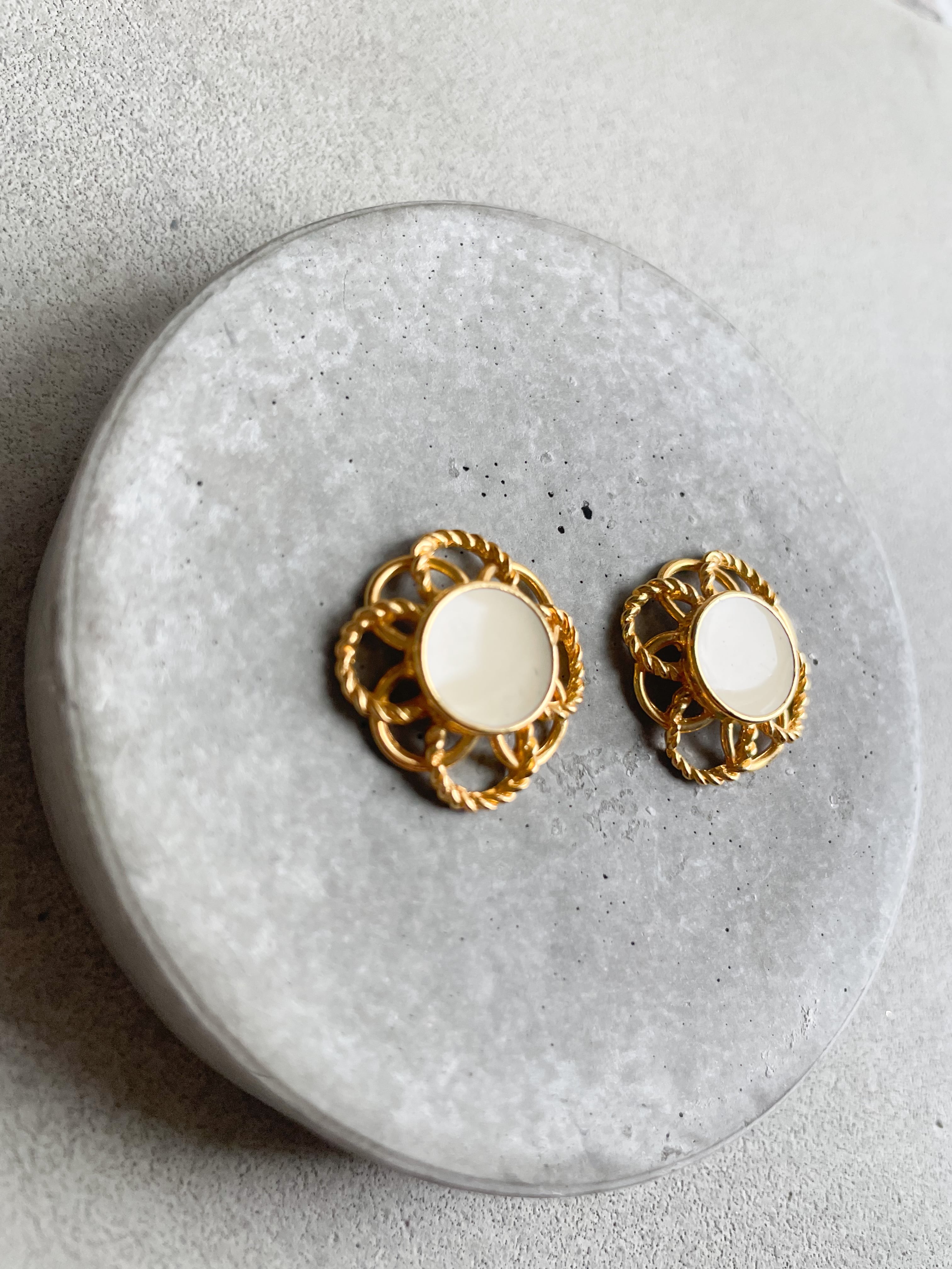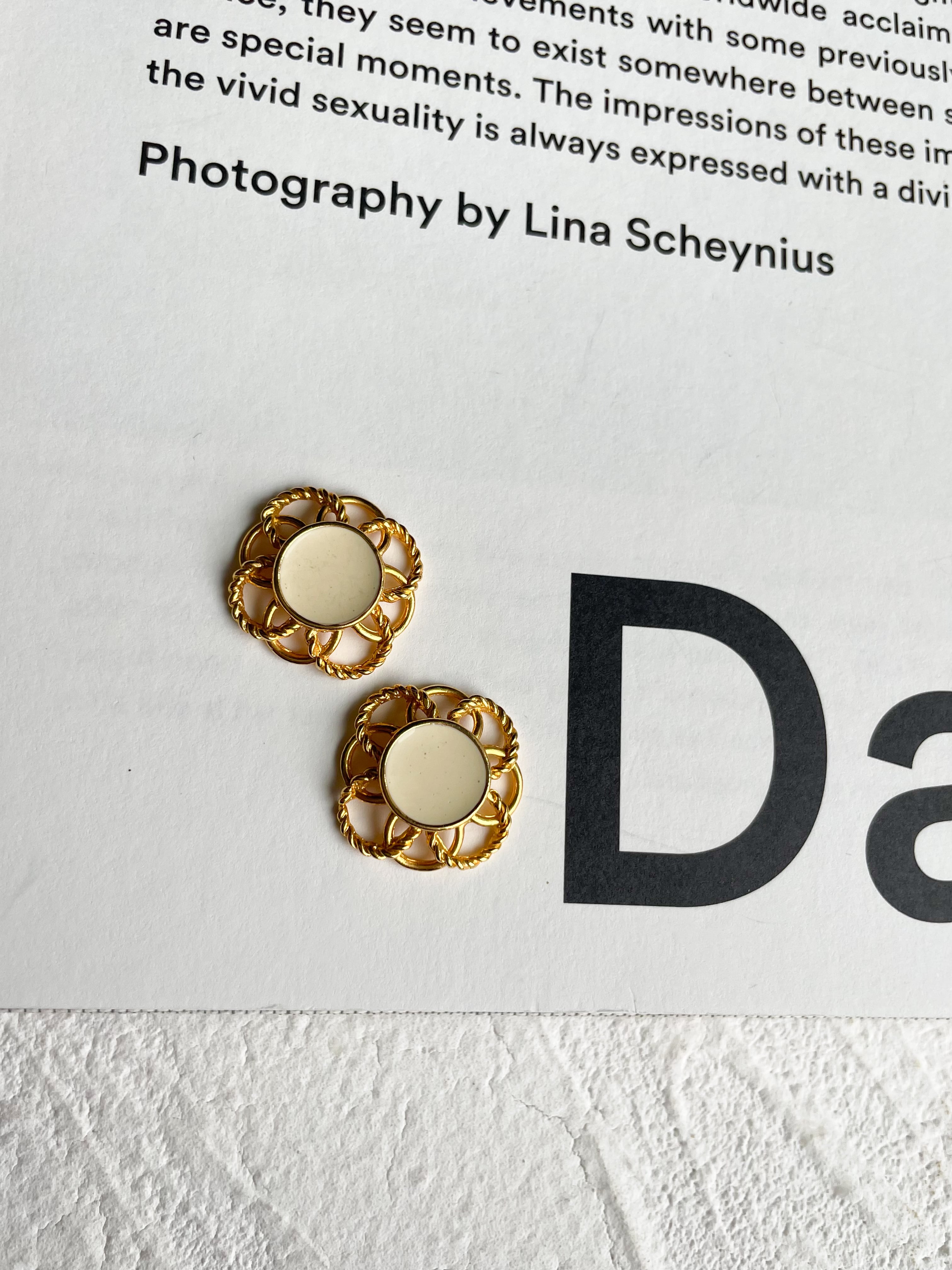 エナメルのクリームベージュを中心にヴィンテージならではの風合いのgoldでフラワーボタンです。