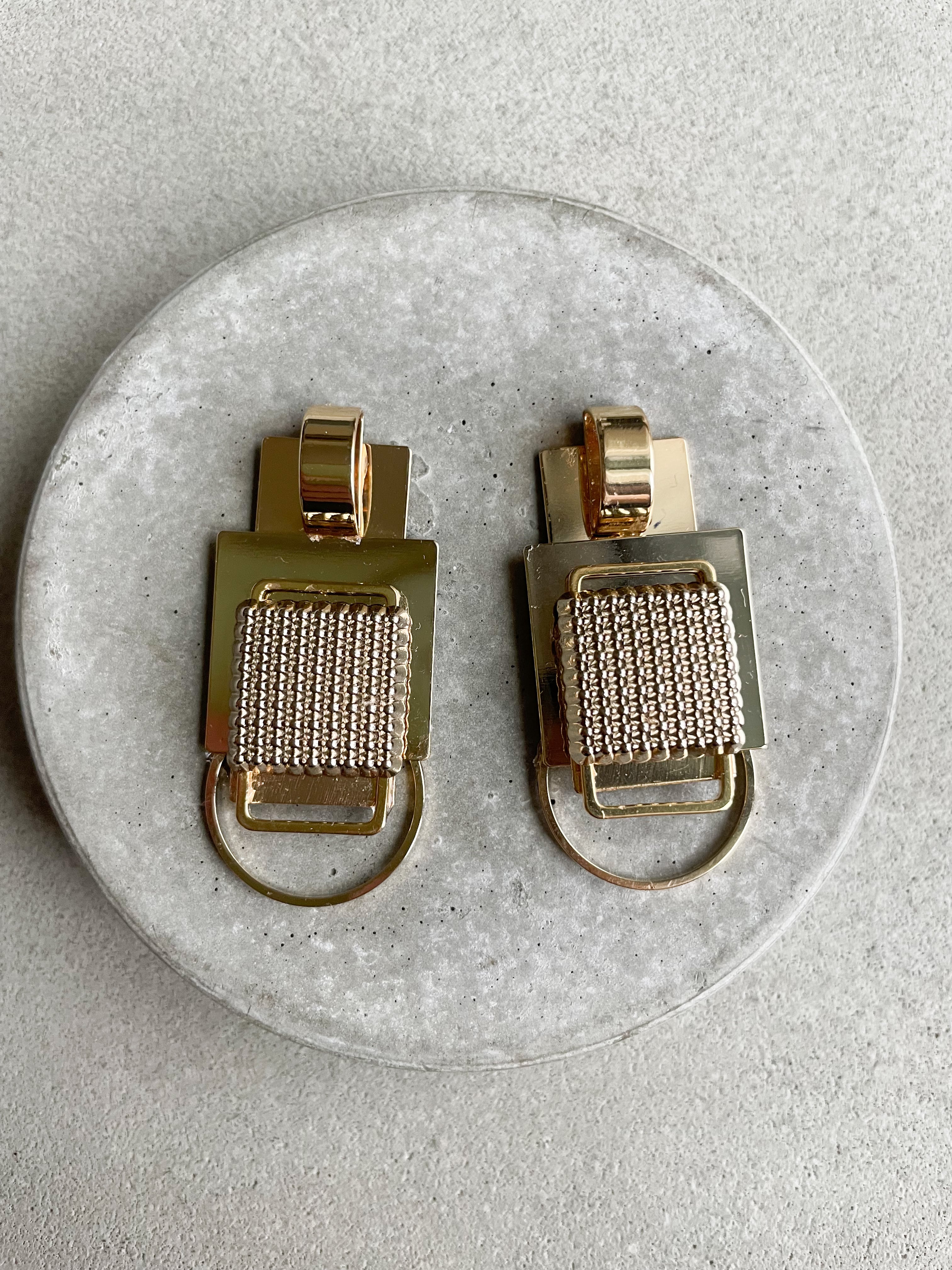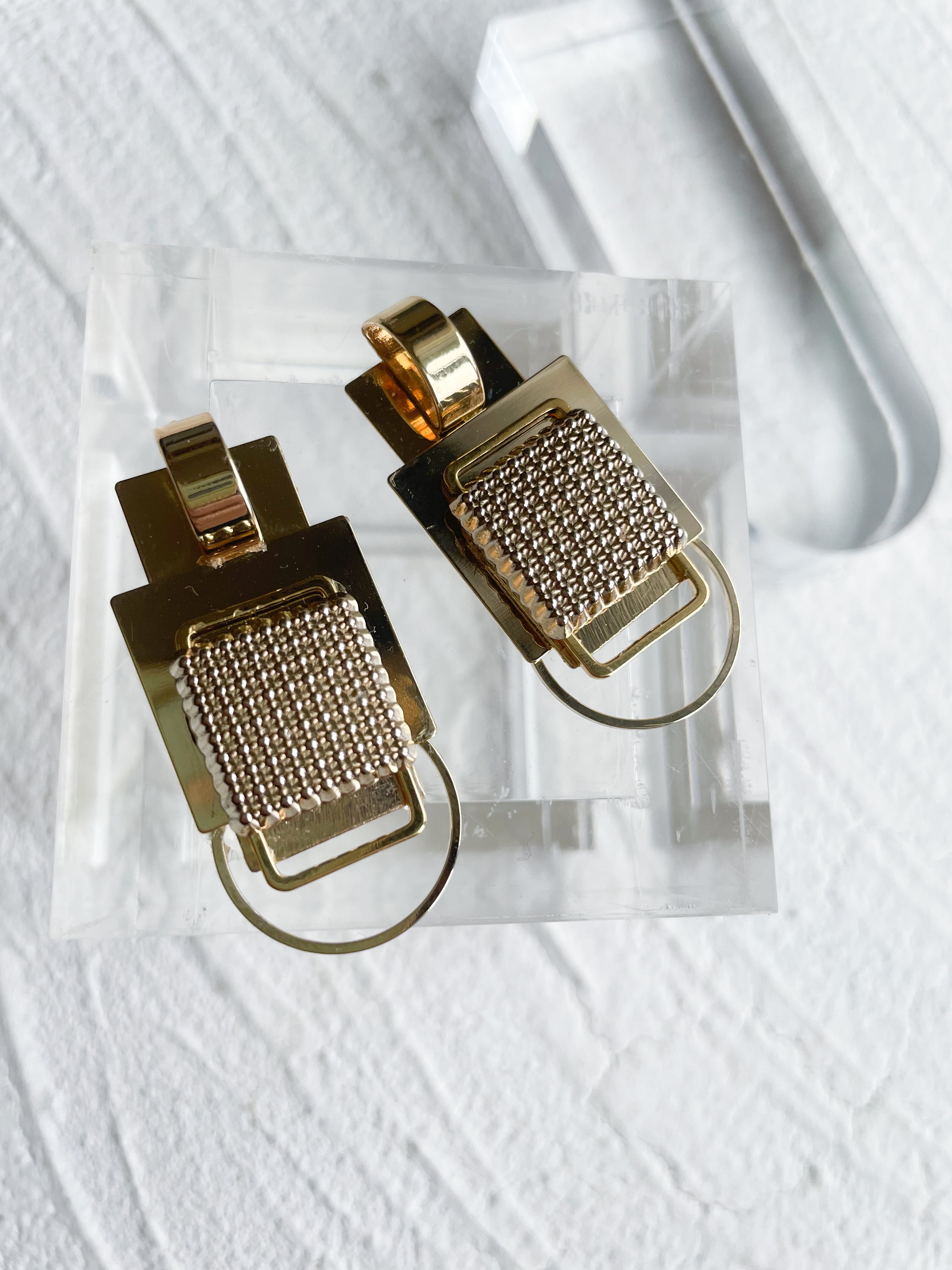 スクエア型のメタルボタンに様々な種類のスクエアパーツを合わせ遊び心のある個性的なデザインです。