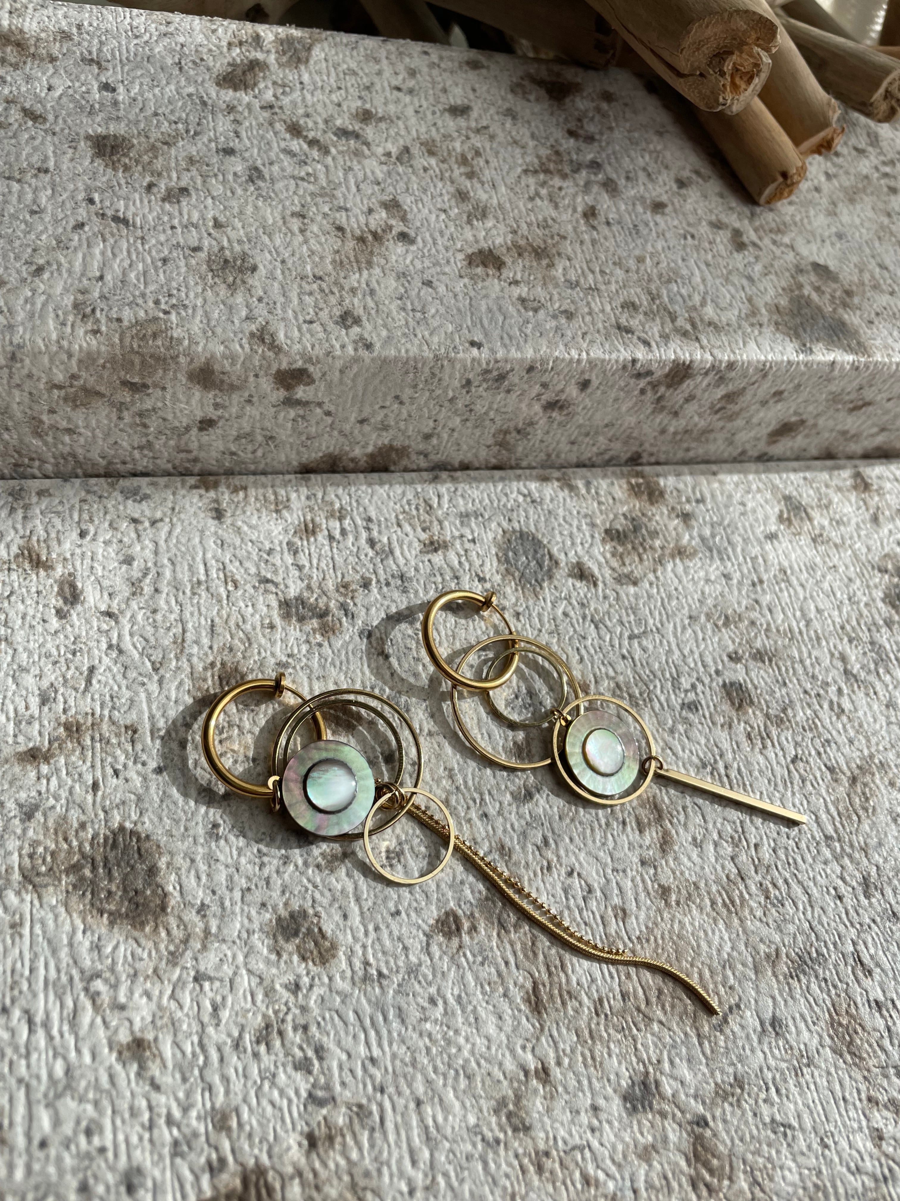 パープルやグリーンのグラデーションが魅力的な黒蝶貝のボタンを使用したフープデザインです。